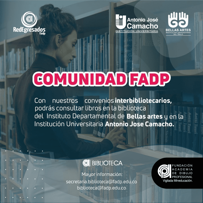 Comunidad FADP con nuestros convenios Inter bibliotecarios, podrás consultar libros en: La biblioteca del Instituto Departamental de Bellas Artes y En La Institución Universitaria Antonio Jose Camacho. Link de Redirección: www.instagram.com/p/CpD21pIvpSh/