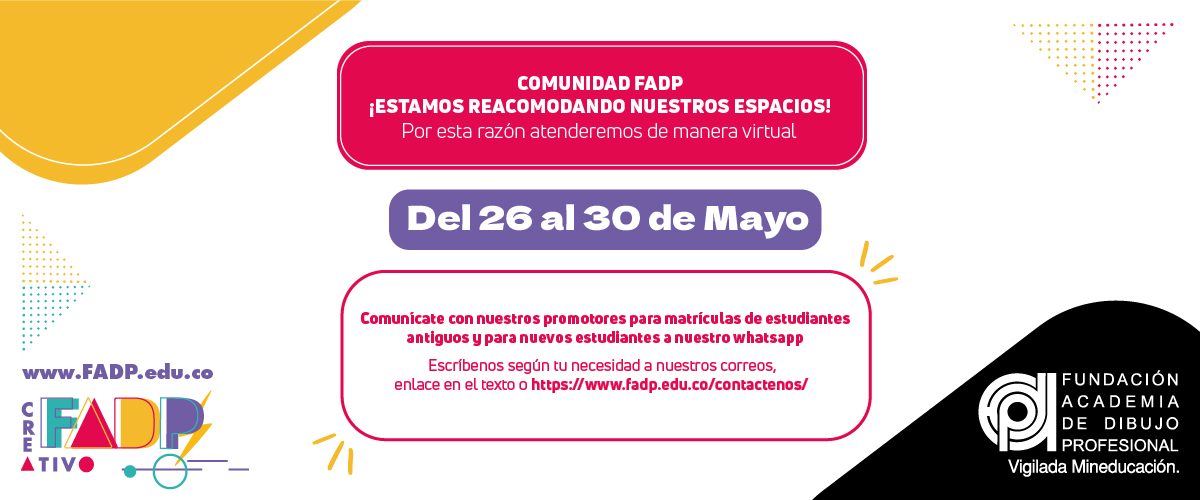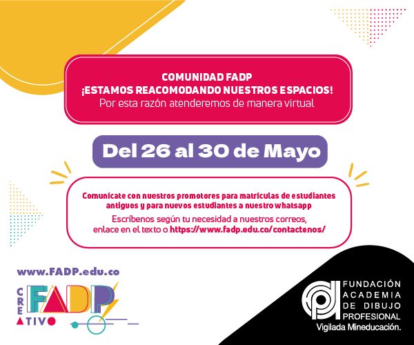 En cumplimiento de la Ley Estatutaria 1581 de 2012, el presente Aviso de Privacidad tiene como finalidad poner en conocimiento del titular la Política de Tratamiento de Datos Personales de la Fundación Academia de Dibujo Profesional la cual podrá ser consultada en este sitio web o a través del correo electrónico datospersonales@fadp.edu.co. A través de este sitio web la FADP recolecta y almacena datos personales; por medio de cookies y formularios. Si continúa navegando usted está dando su consentimiento previo, expreso e informado para el tratamiento de sus datos. A su vez indicando el conocimiento de nuestra Política de Tratamiento de Datos Personales.