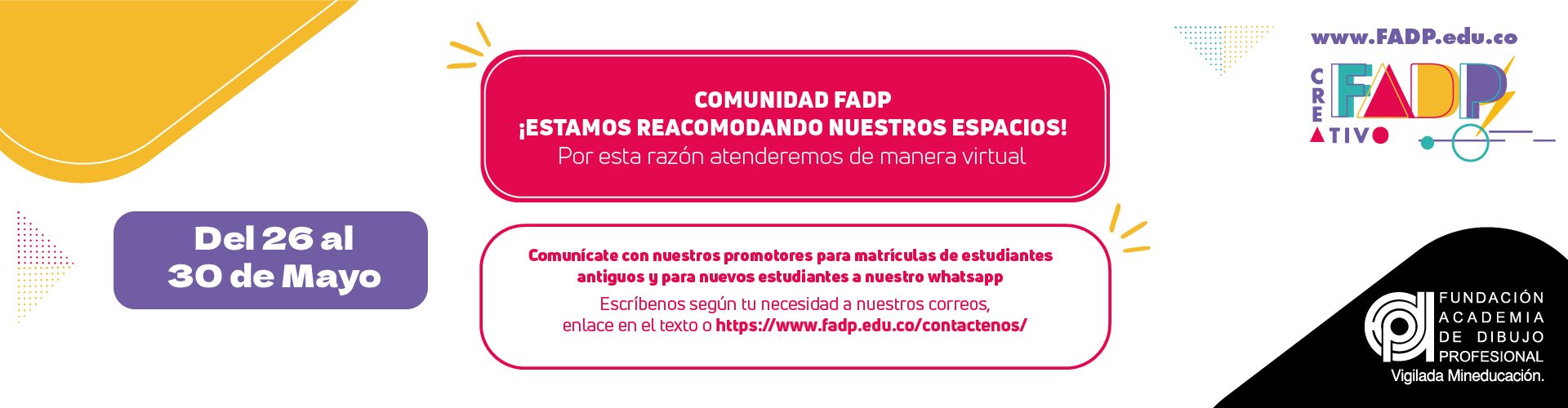 Durante el 26 al 30 de mayo estaremos atendiendo a nuestra Comunidad FADP y a interesados en nuestros programas por medio de estos celulares: