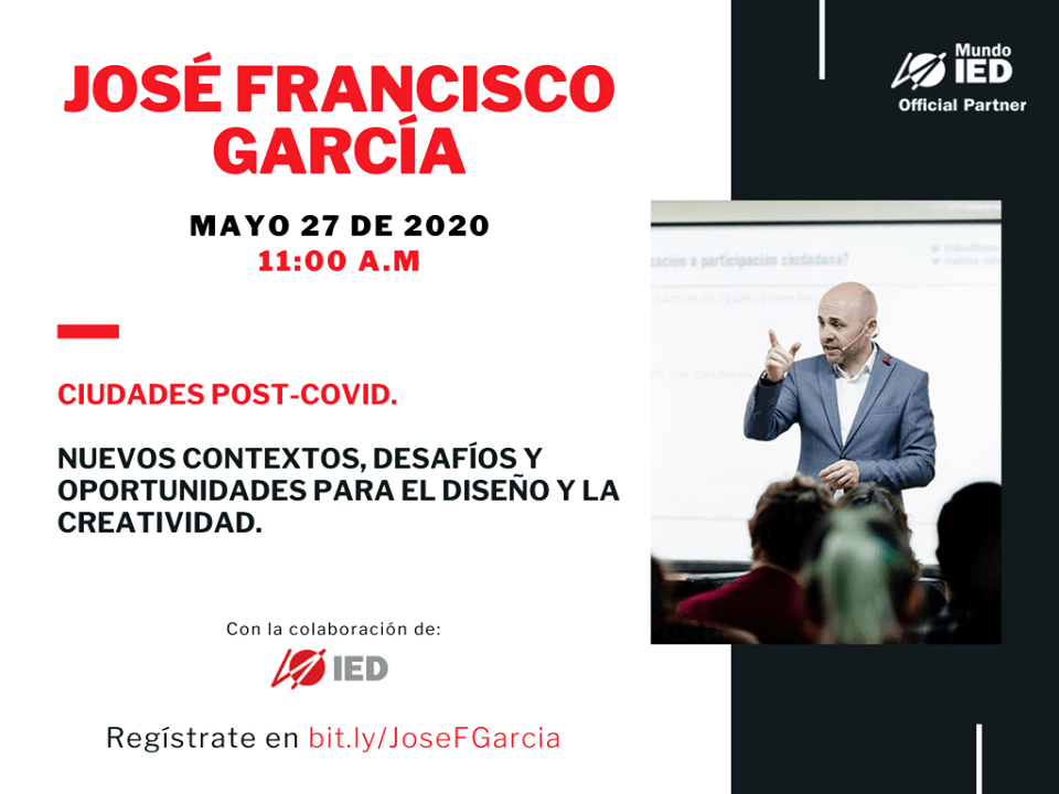 Invitamos a la comunidad académica a participar del próximo Webinar del Istituto Europeo Di Design (IED): “CIUDADES POST-COVID. NUEVOS CONTEXTOS, DESAFÍOS Y OPORTUNIDADES PARA EL DISEÑO Y LA CREATIVIDAD” a cargo de José Francisco García, el próximo miércoles 27 de mayo a las 11:00 a.m. (GMT -5:00 Colombia). Regístrate Aquí