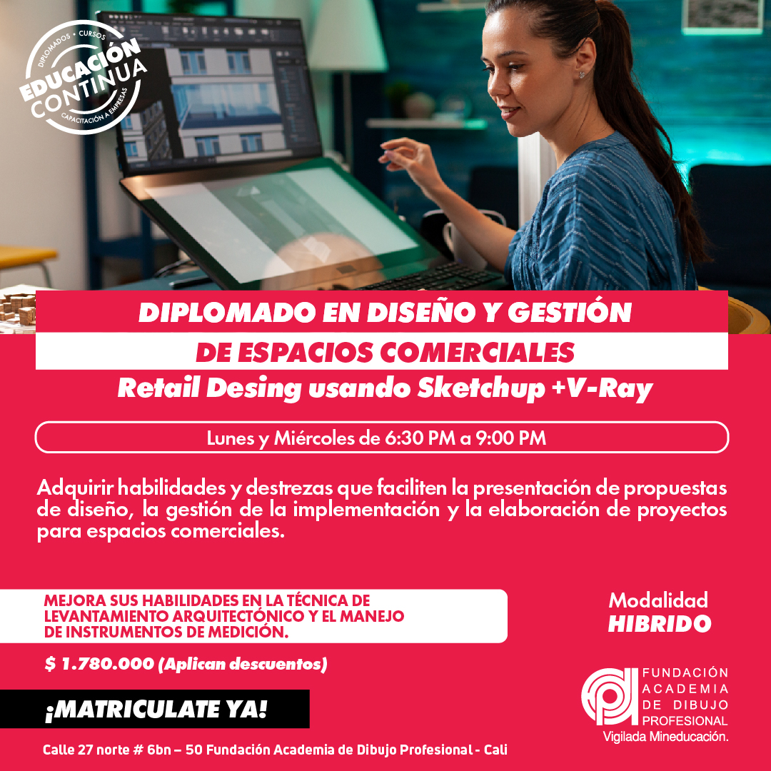 Aprende a diseñar desde cero, usando la herramienta de software Sketchup, mejorando espacios, maximizándolos. En este diplomado se manejan referencias y ejemplos aplicables todo espacio comercial, tales como: Restaurantes, punto de venta de comidas, oficinas, bares, discotecas, tiendas y almacenes de retail, espacios institucionales y de atención de público (bibliotecas), puntos de venta de concesionarios de vehículos, entre muchos otros.