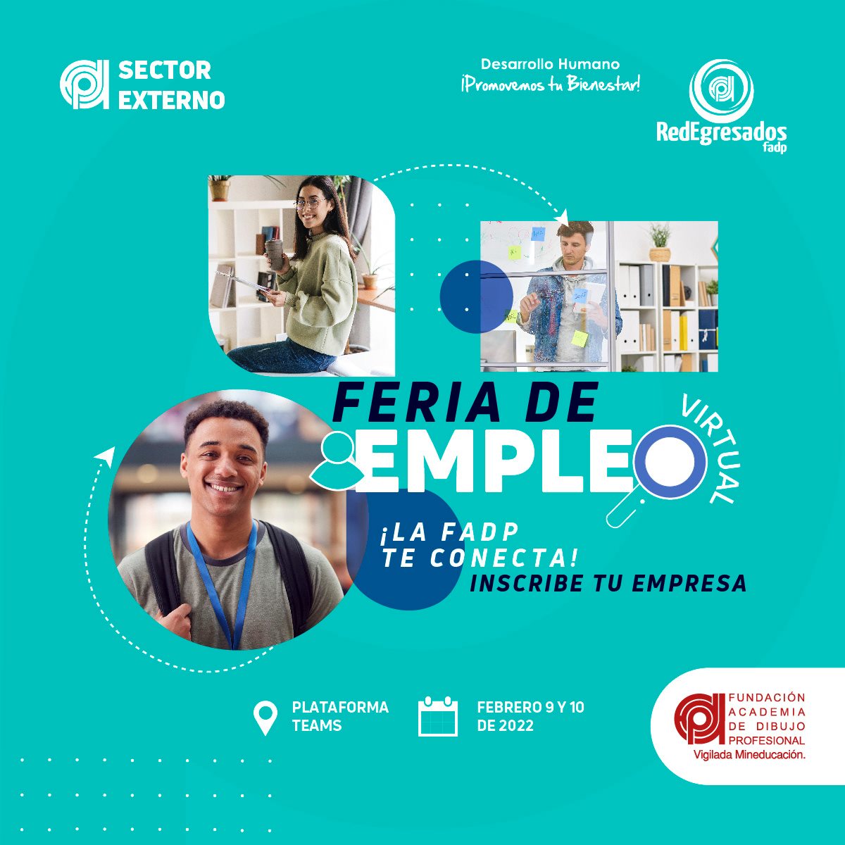 Con el fin de fortalecer el vínculo con el sector productivo y generar mecanismos para la inserción al mundo laboral en nuestros estudiantes y egresados, se llevará a cabo el 9 y 10 de Febrero del próximo año la I Feria de Empleo FADP de manera virtual.