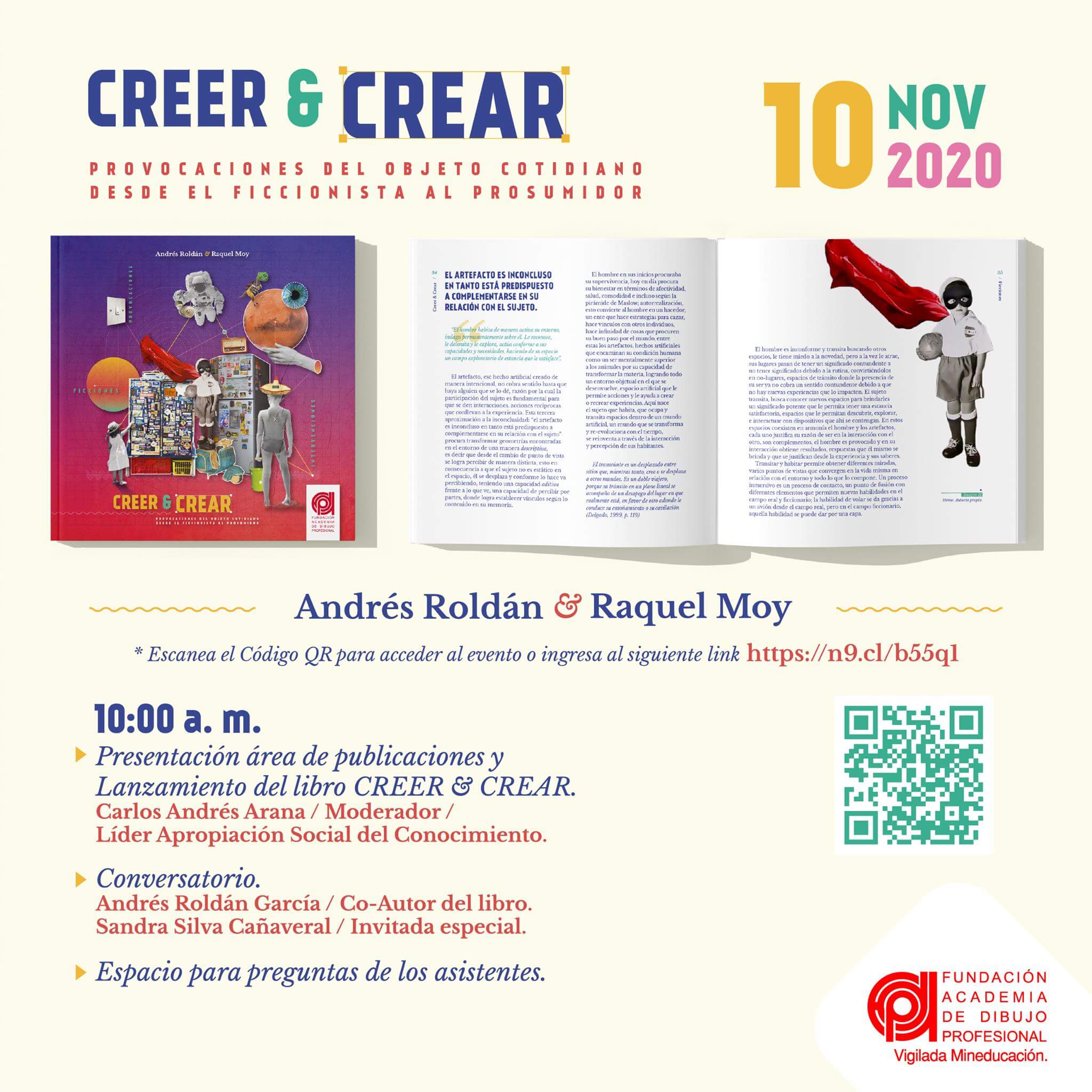 El área de Apropiación Social del Conocimiento de la Fundación Academia de Dibujo Profesional invita a la comunidad académica y en general a participar del lanzamiento oficial del libro “Creer & Crear. Provocaciones del objeto cotidiano del ficcionista al prosumidor” de la autoría de los docentes y diseñadores Andrés Felipe Roldan García y Raquel Moy Arcila. A partir del análisis de la relación que se gesta entre los objetos, los individuos y los entornos, Roldan y Moy nos invitan a reflexionar sobre la cotidianidad estética que tiene lugar en las prácticas culturales igualmente cotidianas. En este sentido, sean todos y todas bienvenidas a ser parte de este espacio reflexivo que tendrá lugar el próximo martes 10 de noviembre de 2020 a las 10:00 a. m. en la sala virtual Teams.