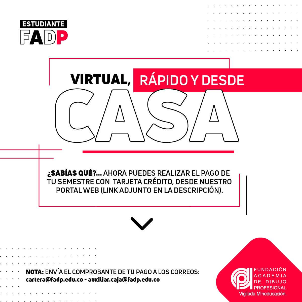 Desde casa realiza el pago de tú matrícula a través de los medios que la FADP tiene para ti. Recuerda realizar el envío de los comprobantes de pago a: cartera@fadp.edu.co y auxiliar.caja@fadp.edu.co Puedes realizar el pago total o el pago de las cuotas informando el detalle en la descripción del pago.