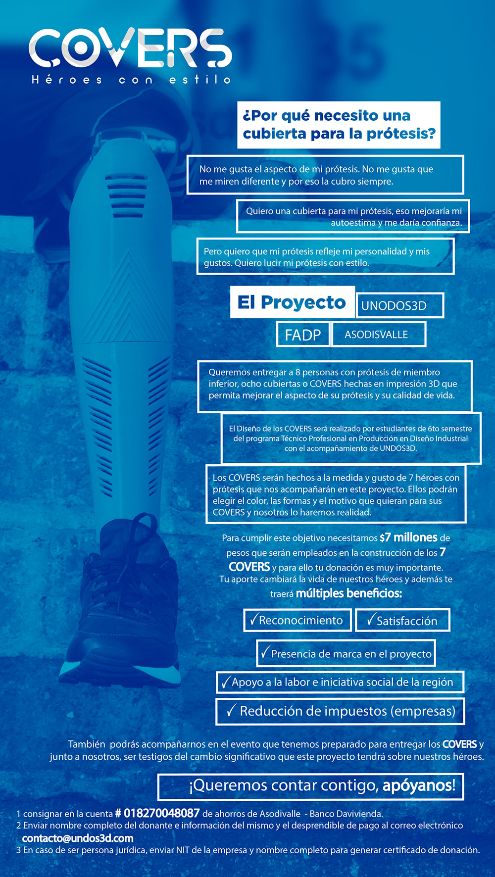 El proyecto se da bajo un convenio firmado entre la empresa UnDos3D, Asociación de discapacitados del valle -Asodi… y la FADP. Para su ejecución se requiere de un monto de dinero que se recaudará a través de donación de empresas o personas naturales. Para mayor información entra a www.undos3d.com y conoce todos los pasos.