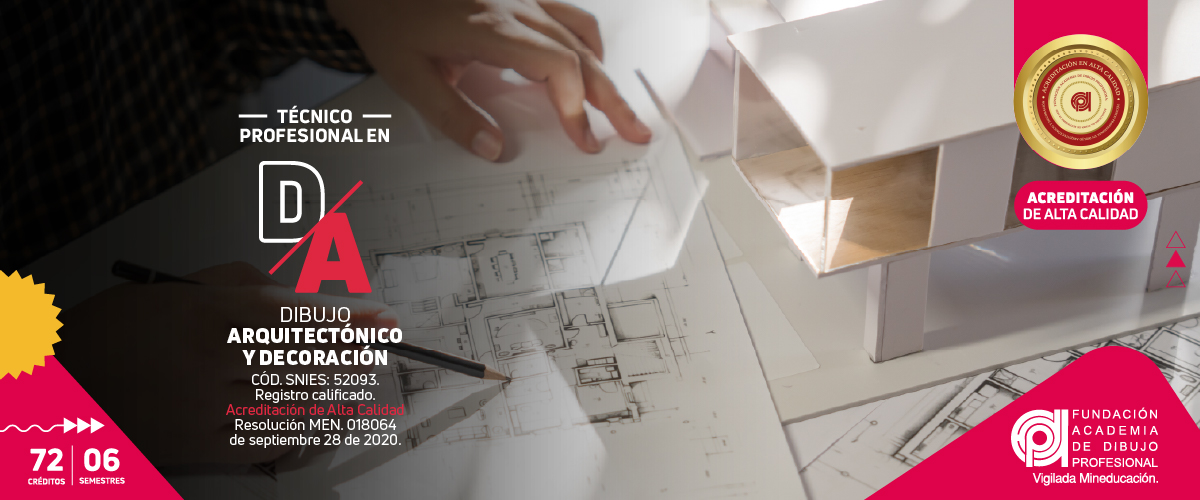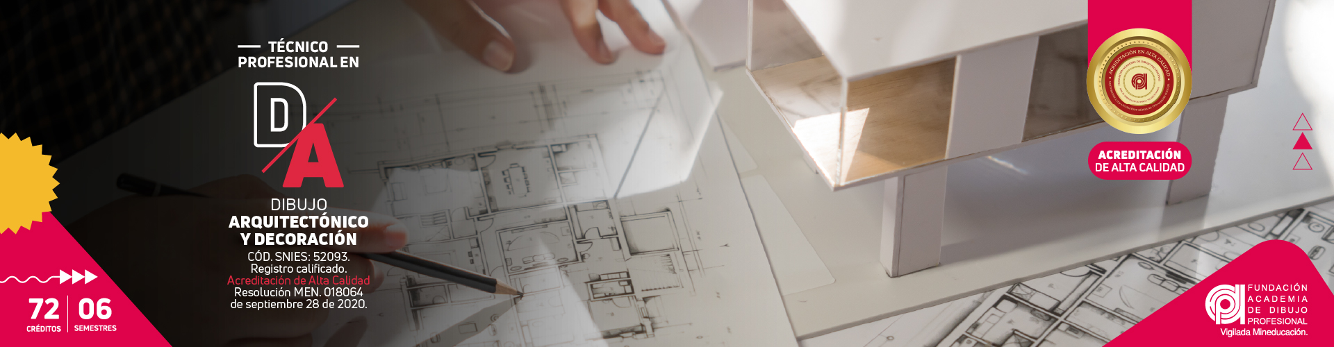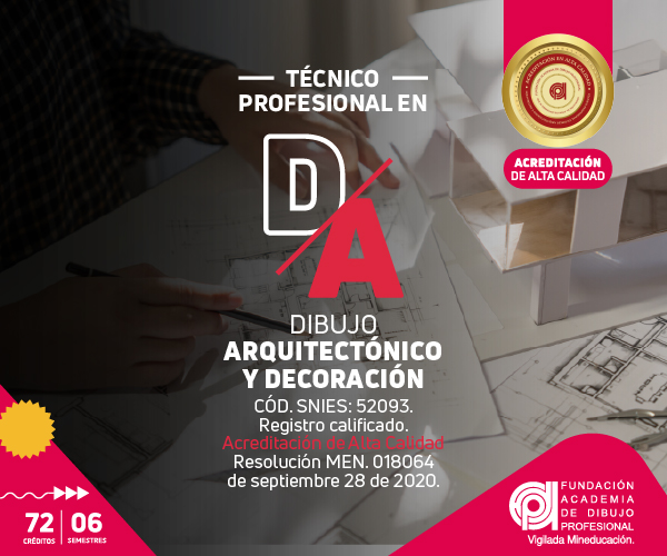 El Programa Técnico Profesional en Dibujo Arquitectónico y Decoración de la Fundación Academia de Dibujo Profesional te capacita con pasión por la investigación y la representación de proyectos arquitectónicos, elaboración de maquetas, decoración de espacios interiores y adecuación de espacios exteriores, complementando sus propuestas espaciales a partir de estilos, colores, materiales y mobiliario, impregnando en los espacios identidad y confort.