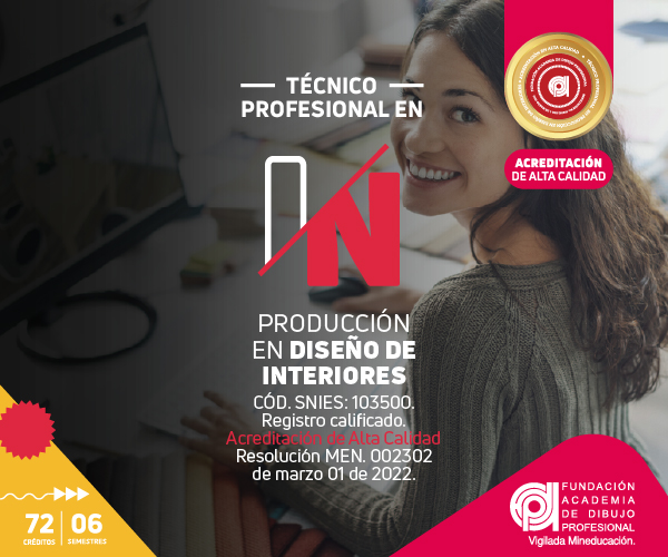 El Programa Técnico Profesional en Producción en Diseño de Interiores de la Fundación Academia de Dibujo Profesional, te capacita para hacer FUNCIONAL un ambiente, enriqueciendo la calidad de vida de las personas, transformando su hábitat, en condiciones de competitividad, solidaridad y respeto por el medio ambiente, como también busca la ARMONÍA entre el espacio interior y exterior expresando Innovación y desarrollando una equilibrada formación espacial.